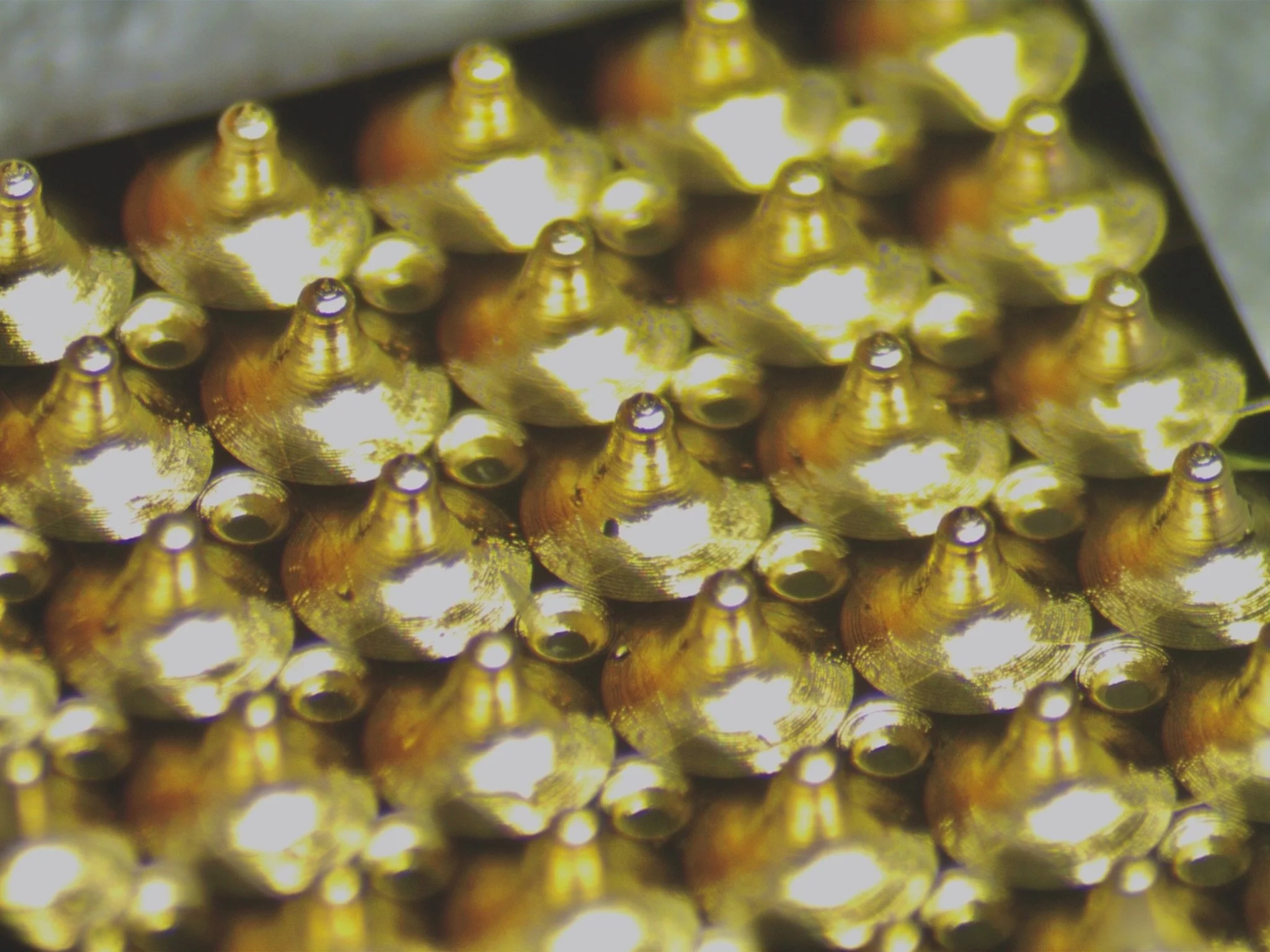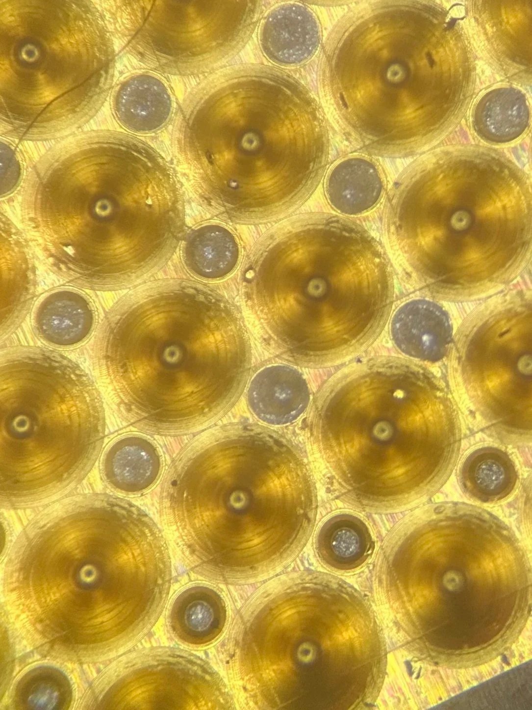 The microneedle electrode array was 3D-printed at the micro-scale using 2-photon polymerization similar to the effect used for Calcium imaging. It’s printed in a acrylic-like resin and takes isopropanol to dissolve uncured resin. To make it conductive, my collaborators coated it in a Chromium/Gold film that was less than 200 nanometers thick using RF sputtering at MIT Nano.