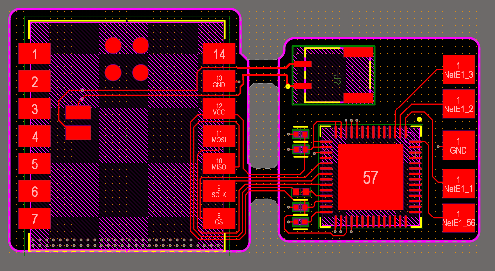 I started my PCB design in Altium to connect the microcontroller to the Intan chip using this paper as a reference. The SPI interface needs MOSI, MISO, SCK, and CSN, which are signals controlled by the microcontroller. Other than that, the chip needs some pads to connect the electrodes, and 3.3V & Ground. The XIAO microcontroller implements Bluetooth capability and also has a microphone and a accelerometer/gyroscope. These sensors are implemented in a small area on the microcontroller board itself, which can be surface soldered on the PCB I design.